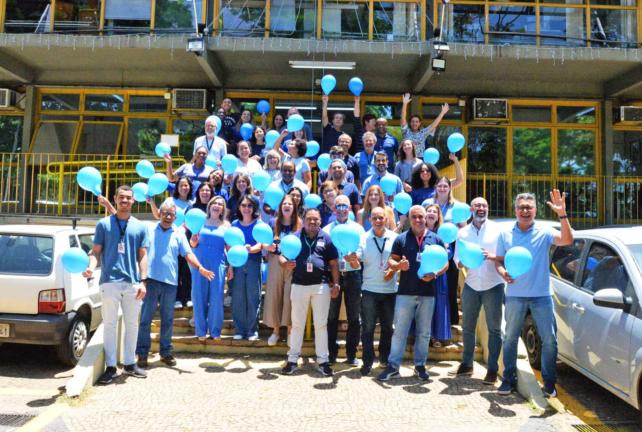 Hoje a escadaria do nosso estacionamento ficou pequena para tanta energia boa! Nossos colaboradores – homens e mulheres – vestiram a camisa (literalmente!) e coloriram o dia de azul.